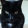 At the very corner of the room is a single door. A black cat lays snoozing on a box near it. ]