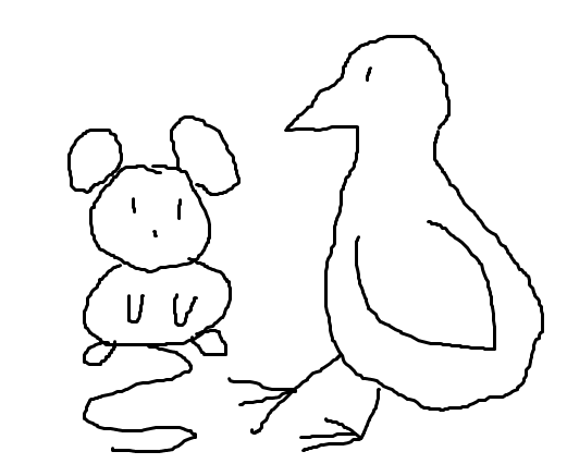 [He takes a moment to decide and then draws... a crappy mouse sitting next to a crappy chicken I don't even know okay.]